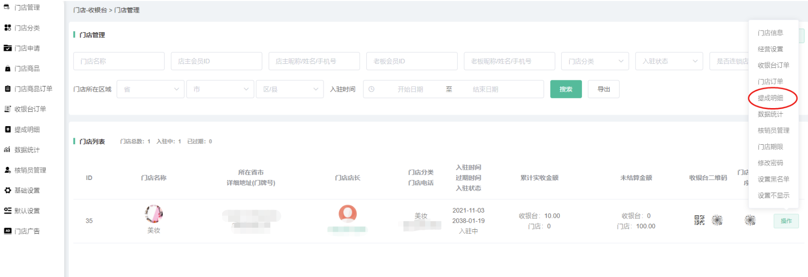 申请通过/后台添加的门店,在门店信息显示,可搜索查看门店的id、名称、所在省市详细地址、门店店长、门店分类、入驻时间、累计实收金额、未结算金额、收银台二维码、门店小程序码等