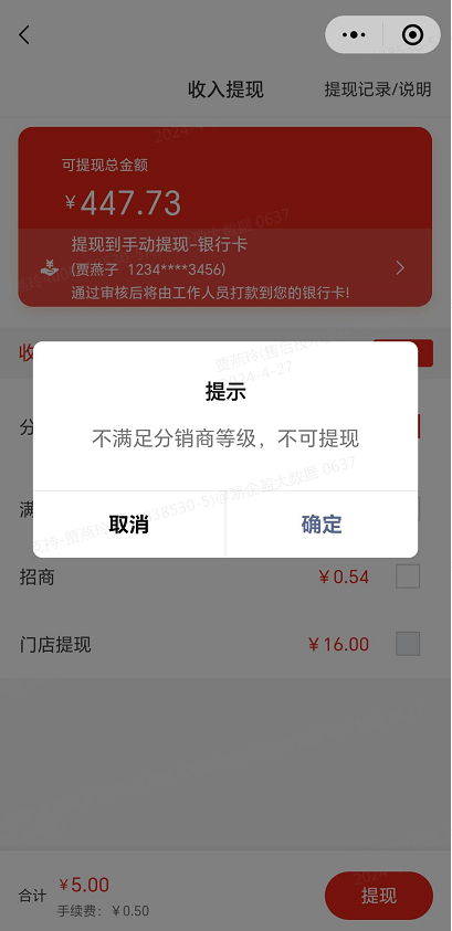 限制提现:开启限制提现,默认等级分销商则不可操作所有收入提现申请,开启后前端申请时会显示:不满足分销商等级,不可提现。