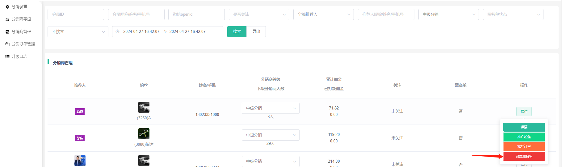 设置黑名单:如果想取消会员获得分销相关分佣,可以在会员列表--会员详情关闭推广员按钮,在分销商管理中设置为黑名单,会员则不会获得相关的分销分润~
