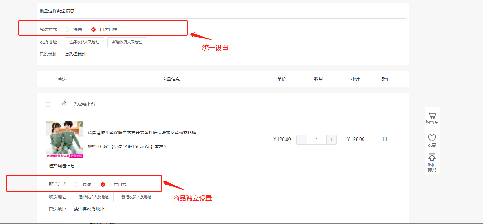 配送方式调整方式有两个,最上面的配送方式代表直接调整所有商品的配送方式,每个商品单独的代表带单独的配送方式。