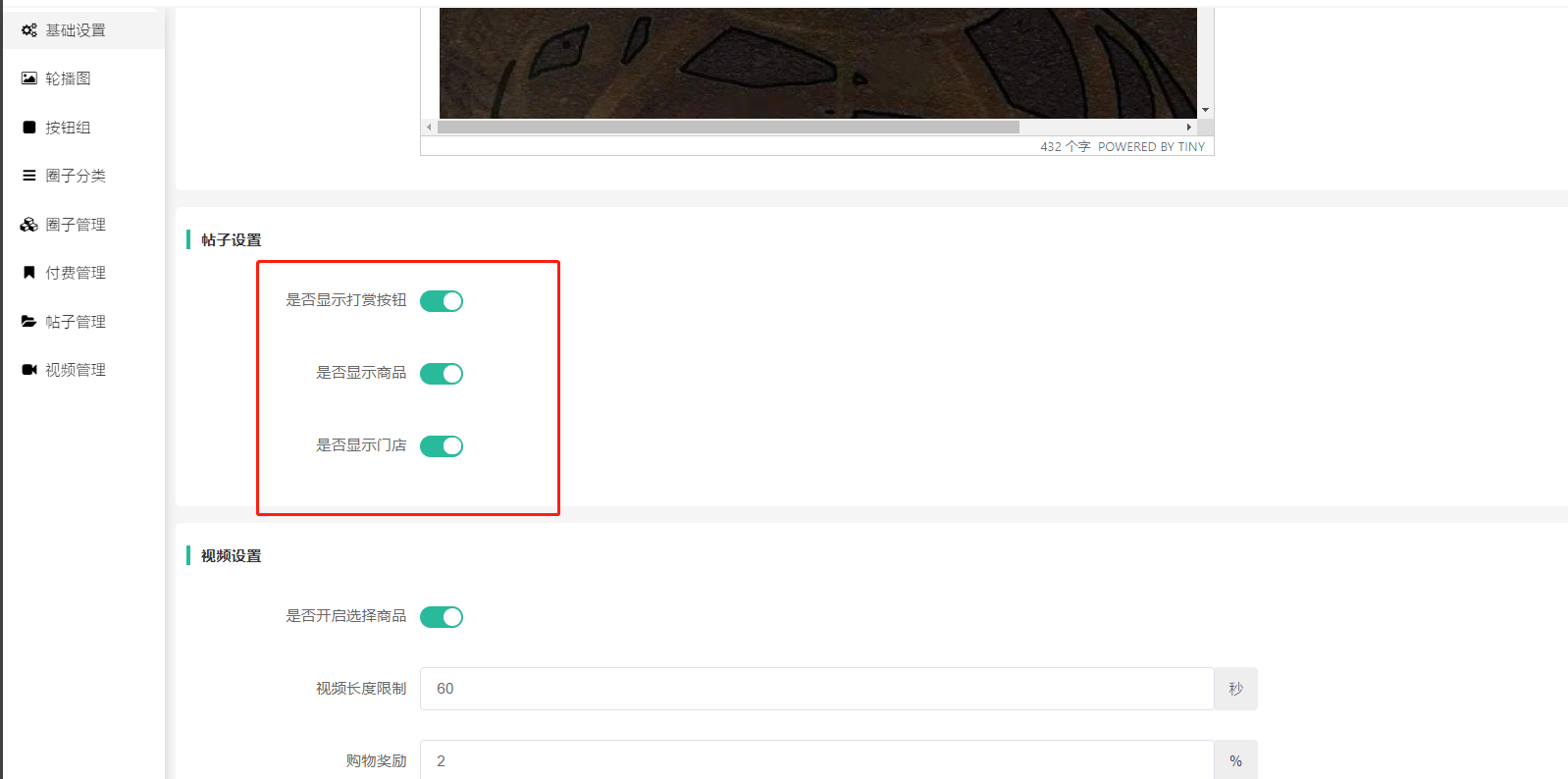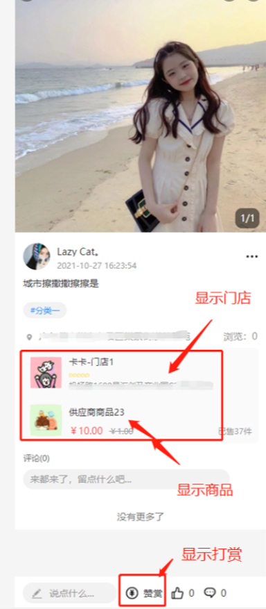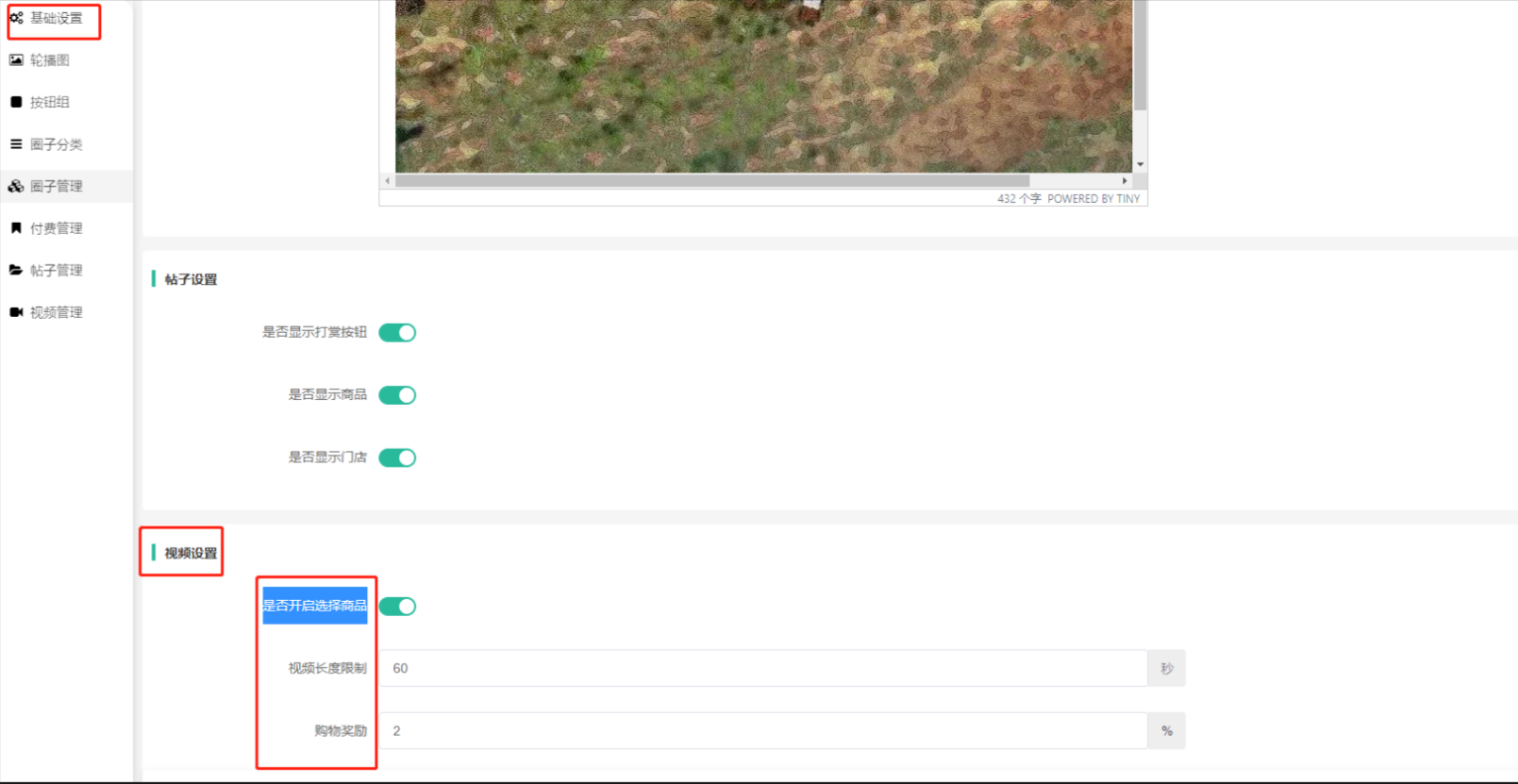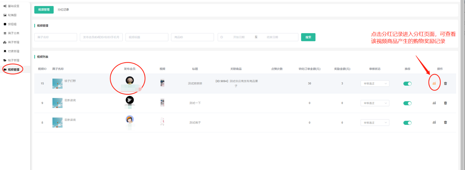 (3)购物奖励(开启选择商品按钮,上传视频发布时候选择了商品,等该视频在后台视频管理处审核通过后。会员进入前端找到该视频购买里面的商品,产生了购物奖励,奖励给发布视频者)