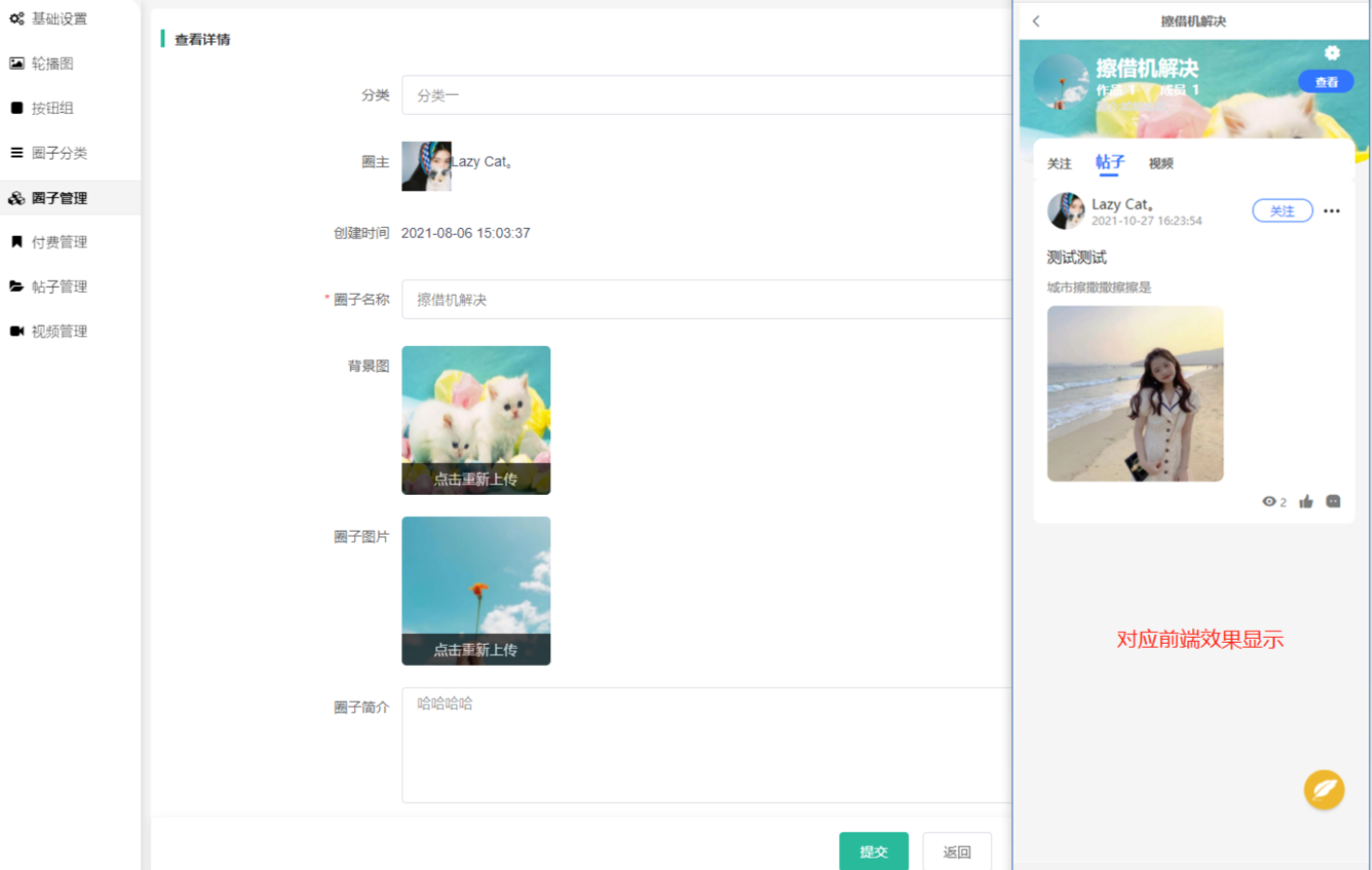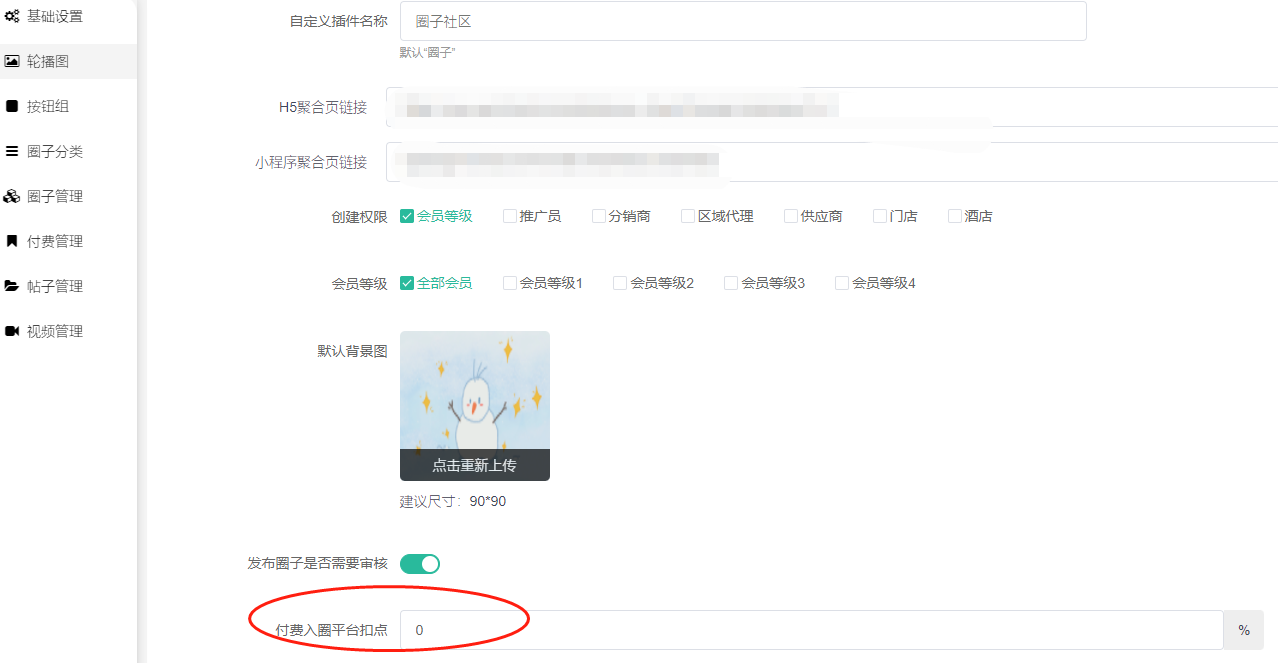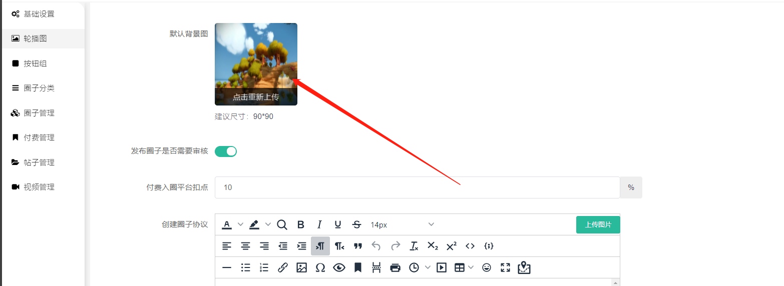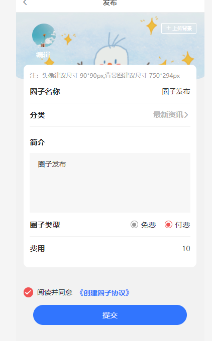 3、默认背景图(支持后台更换默认背景图、前端发布时候会员可以自定义设置单个圈子的背景图)