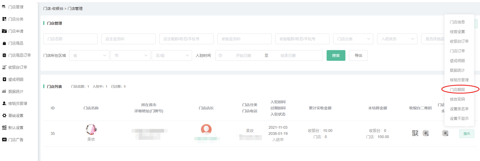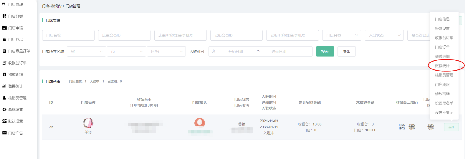 申请通过/后台添加的门店,在门店信息显示,可搜索查看门店的id、名称、所在省市详细地址、门店店长、门店分类、入驻时间、累计实收金额、未结算金额、收银台二维码、门店小程序码等