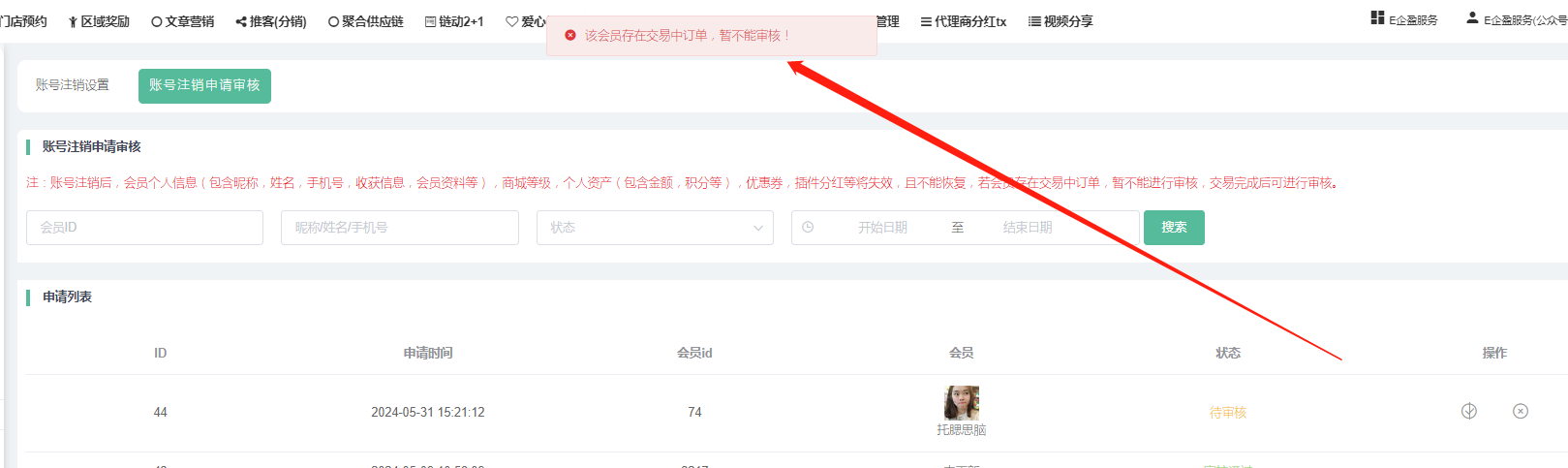 若:管理员勾选同意注册账号时,出现该会员存在交易订单,暂不能审核,需要把这些订单都完成后才能注销掉,或者选择把未完成的订单关闭掉,关闭的订单交易订单金额会原路返还给到用户。