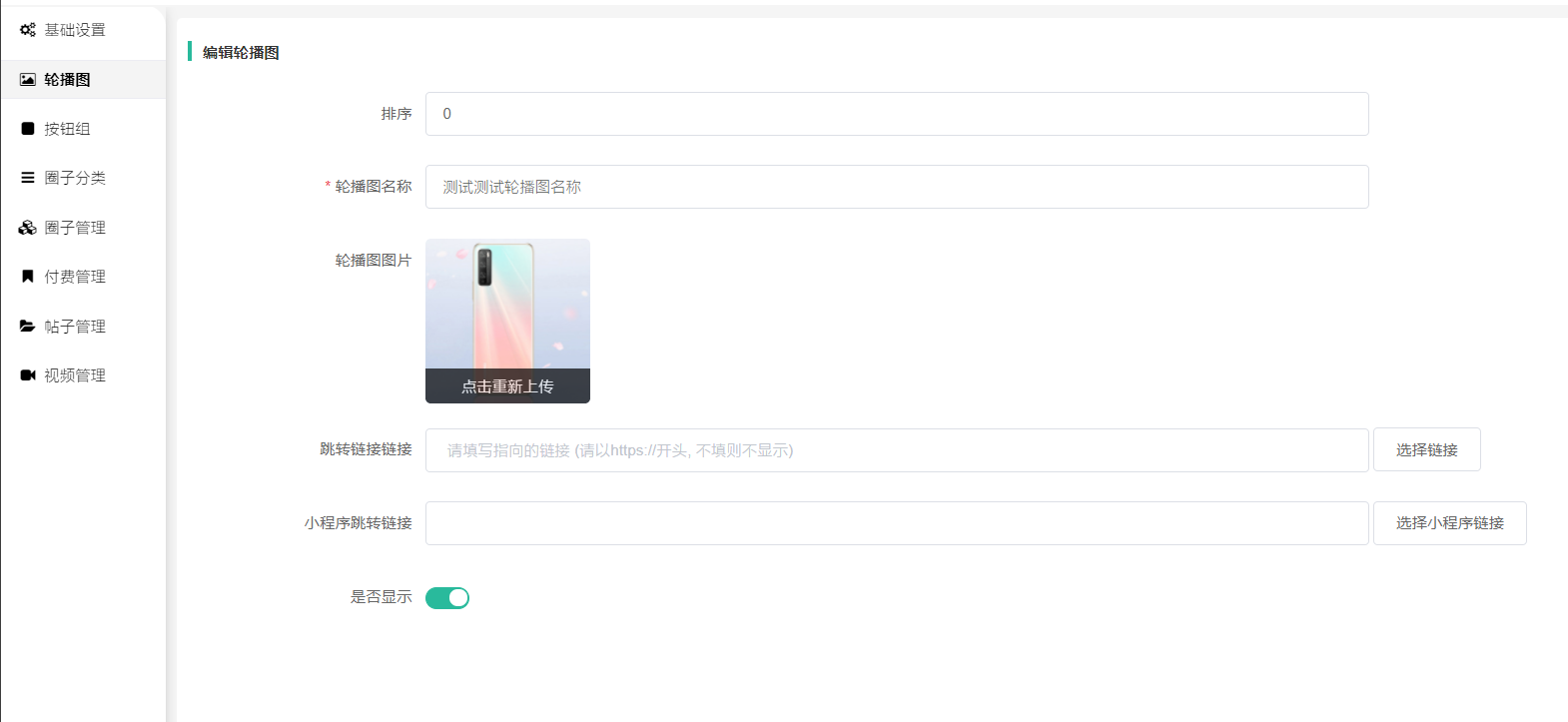 (5)小程序跳转链接:小程序端点击轮播图后需要跳转到哪个页面则填写或者选择页面链接即可