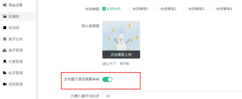 3、默认背景图(支持后台更换默认背景图、前端发布时候会员可以自定义设置单个圈子的背景图)